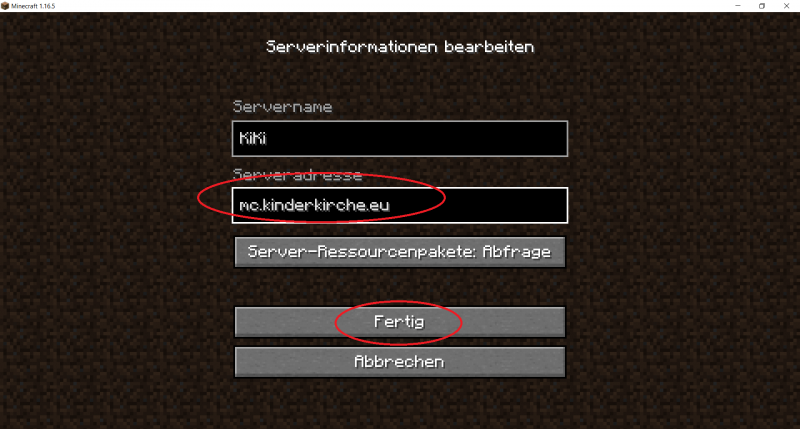 Tragt unsere Server-Adresse mc.kinderkirche.eu ein und klickt auf Fertig. Im oberen Feld könnt ihr euch einen Namen für den Server überlegen (z.B. Kinderkirche oder KiKi).